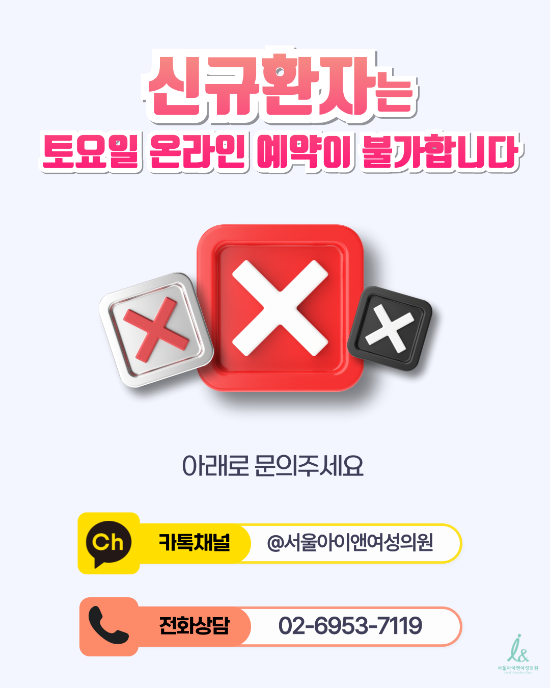 - 변경 시 사전에 유선으로 안내 드릴 예정이오니 이점 양해 부탁드리며, 문의사항은 서울아이앤여성의원 대표번호 (02-6953-7119) 또는 카카오채널 문의하시기 바랍니다.